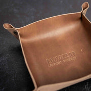This leather catch-all the perfect size for your essentials after a long day. It measures 10”x10” unsnapped and around 7”x7” when it’s put together. You can lay it flat in seconds by undoing the snaps which makes it a perfect travel companion. Features brass hardware and premium full-grain leather.