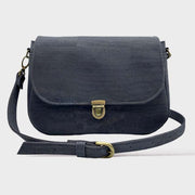 Mid-sized saddlebag purse in environmentally friendly and sustainable cork leather, featuring a vintage-styled push lock closure and adjustable strap with buckle. Inside is a divided slip pocket and a zippered pocket.