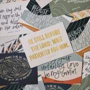This set of Pocket Truths includes 10 unique verse designs, all from the book of Psalms. Each card is 2.5x3.5”, with space on the back to write a short note.