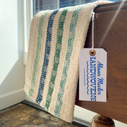 Handwoven in Mississippi by multifaceted artist and designer Allison Meeler, this 100% cotton towel has a rugged texture and high-end feel. It's not just beautiful, but also absorbent and durable. Machine washable. Tumble dry on low.